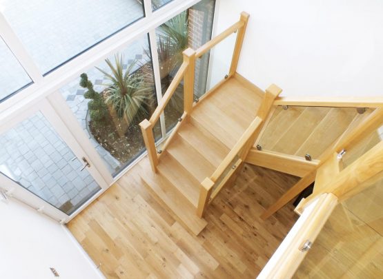 Crafted from American White Ash, the staircase offers a light, natural tone that complements the surrounding interior. The balustrade features vertical glass strips, introducing a distinctive modern detail while maximising transparency and light flow.