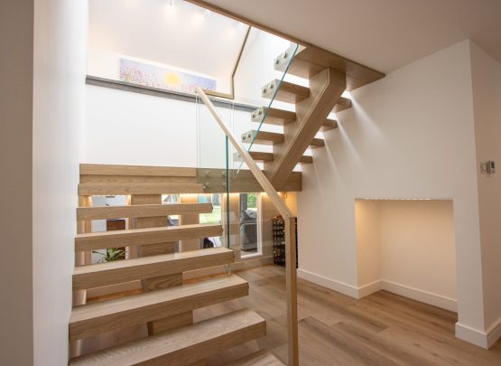 This central spine staircase allows the treads to float effortlessly from the core structure, enhancing the open feel of the space. Free standing glass balustrades complete the design, maximising light and visibility while reinforcing the clean, contemporary aesthetic.