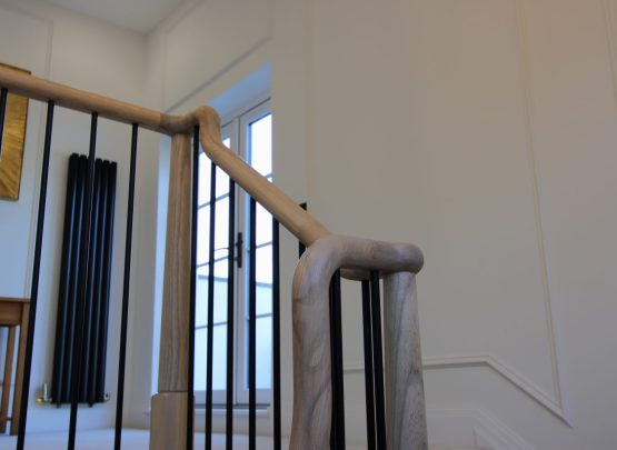 The effect is subtle but powerful: the handrail feels like one continuous gesture, visually tying the staircase together while still expressing its construction.