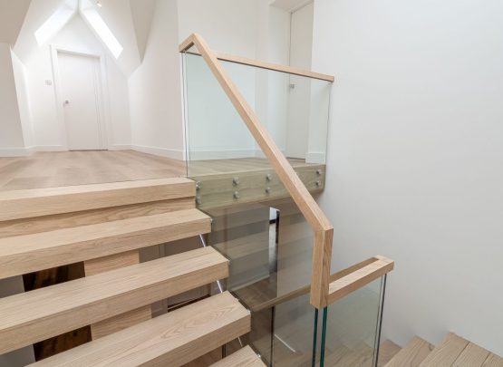 Here, the handrail flows over the tops of newel posts, creating the illusion that it rises directly from the floor and continues uninterrupted along the stair. Rather than stopping at each post (as in post-to-post systems), the rail passes over them, maintaining a smooth, graspable line.