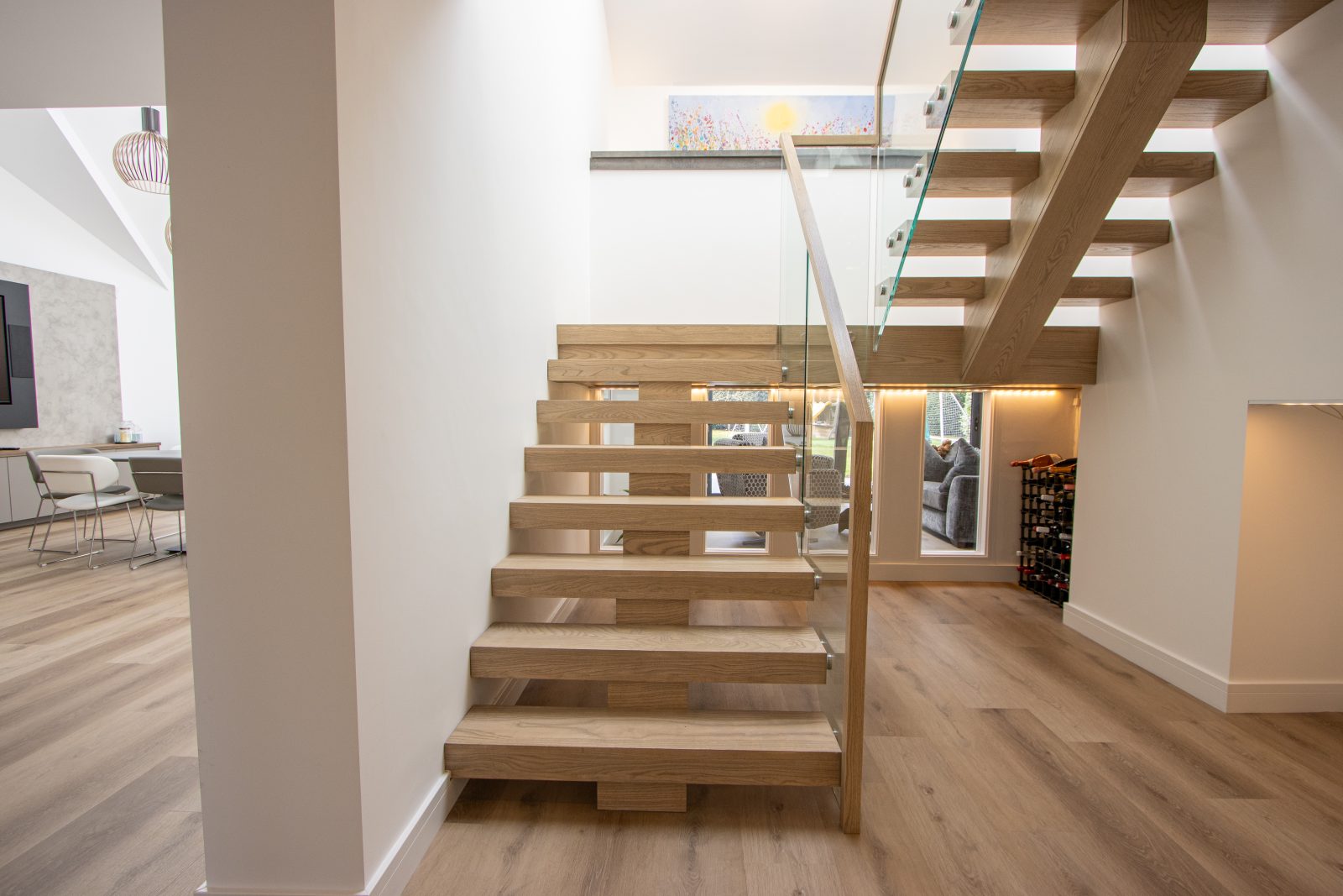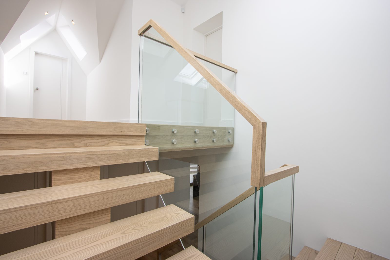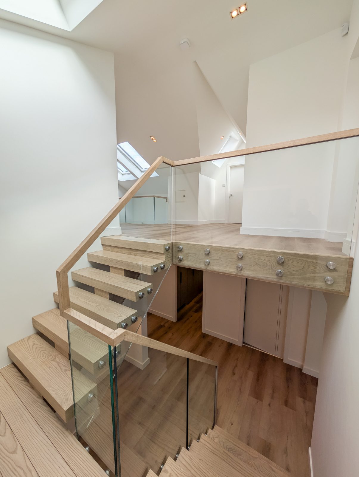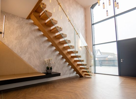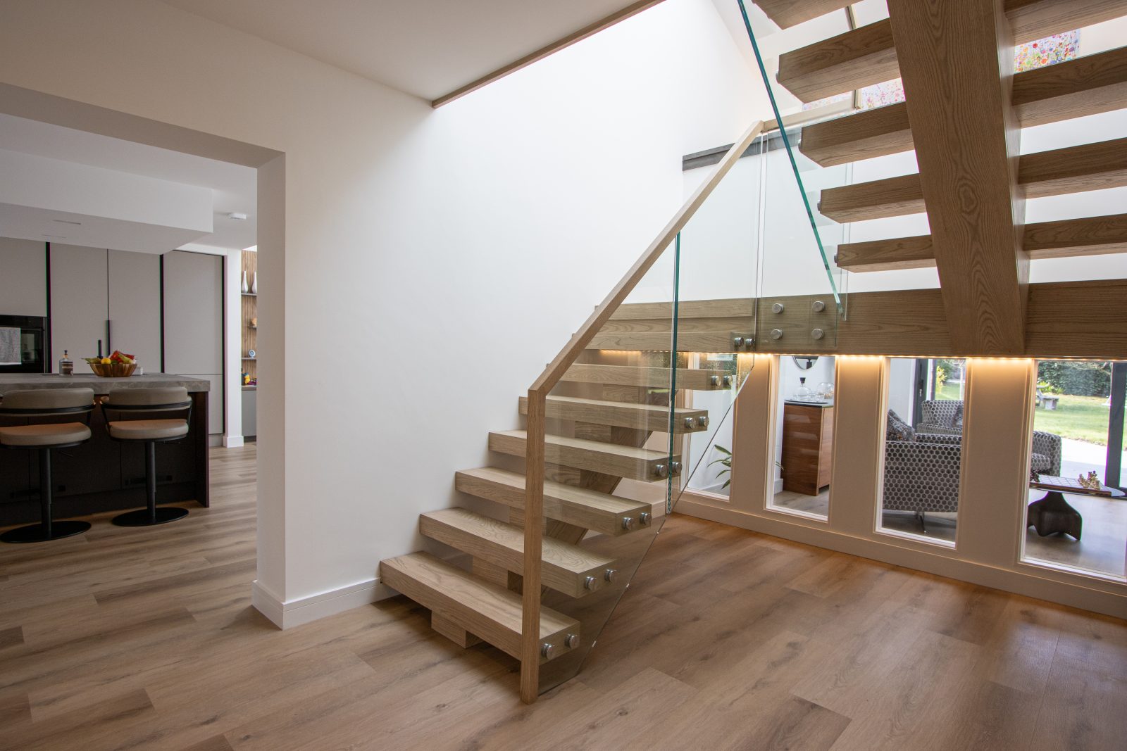 A central feature within this modern home, the staircase is designed to create a striking first impression. The thick oak treads give a floating appearance, complemented by a freestanding glass balustrade with stainless steel fixings and a minimal continuous handrail.