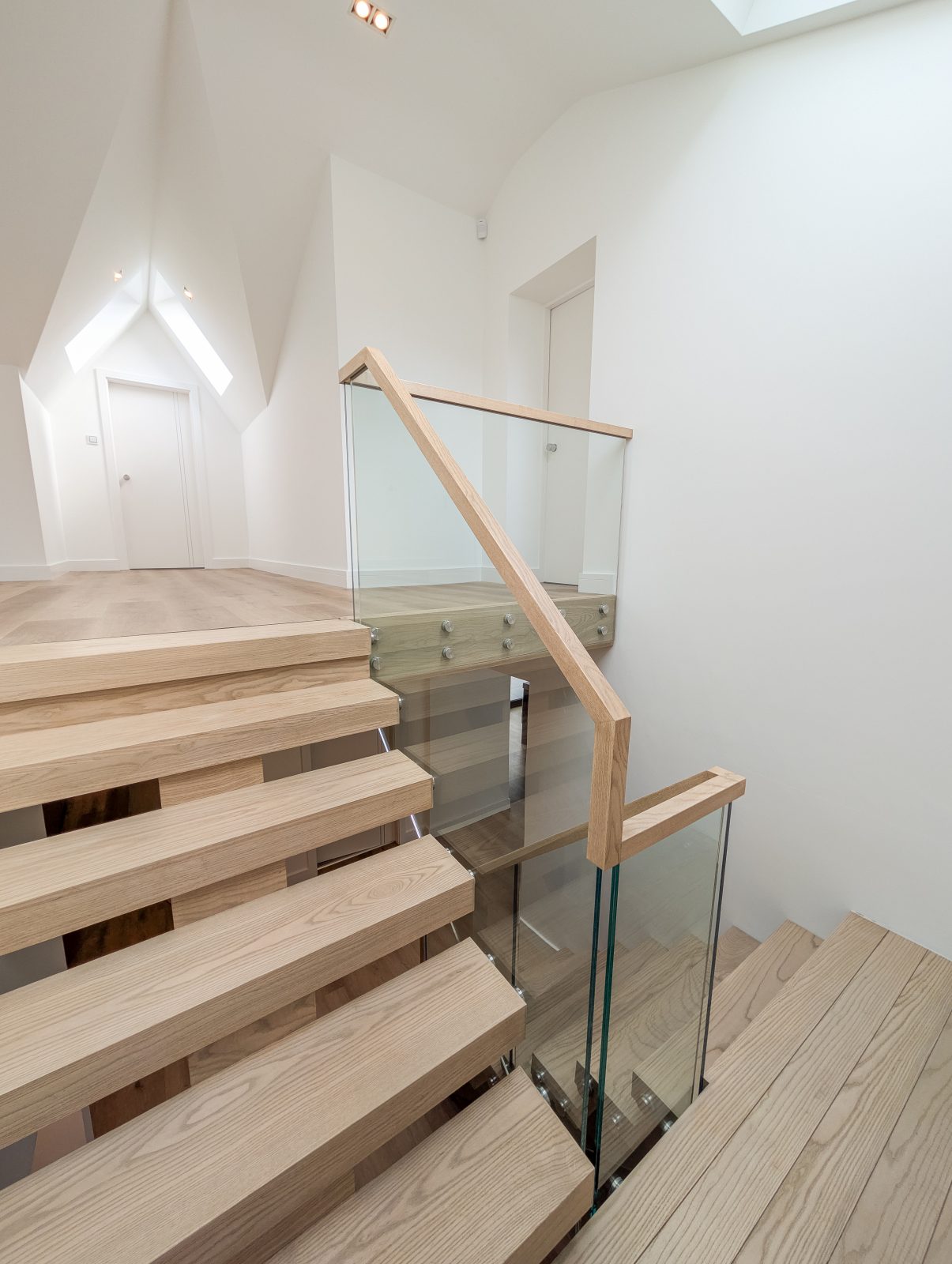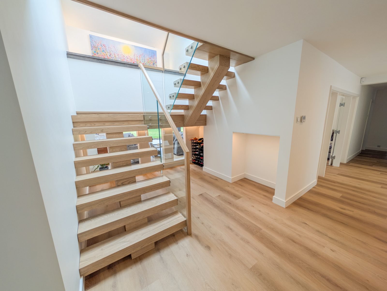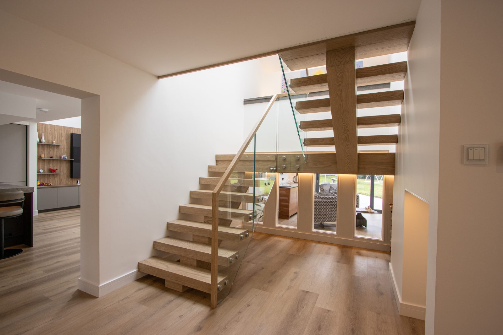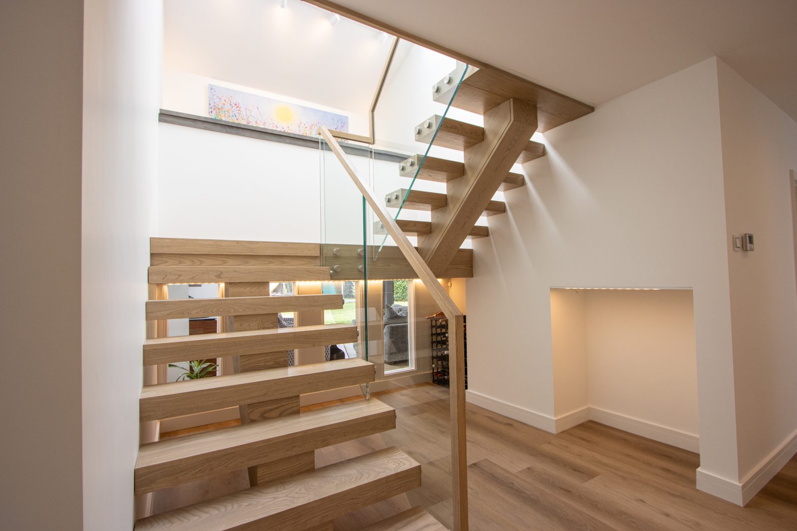 A central feature within this modern home, the staircase is designed to create a striking first impression. The thick oak treads give a floating appearance, complemented by a freestanding glass balustrade with stainless steel fixings and a minimal continuous handrail.