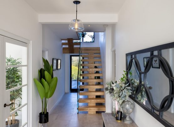 Carefully positioned to maximise light and views, the staircase allows clear sightlines through the space. Skylights above align with the structure, casting natural light onto the steps and enhancing the overall feature.