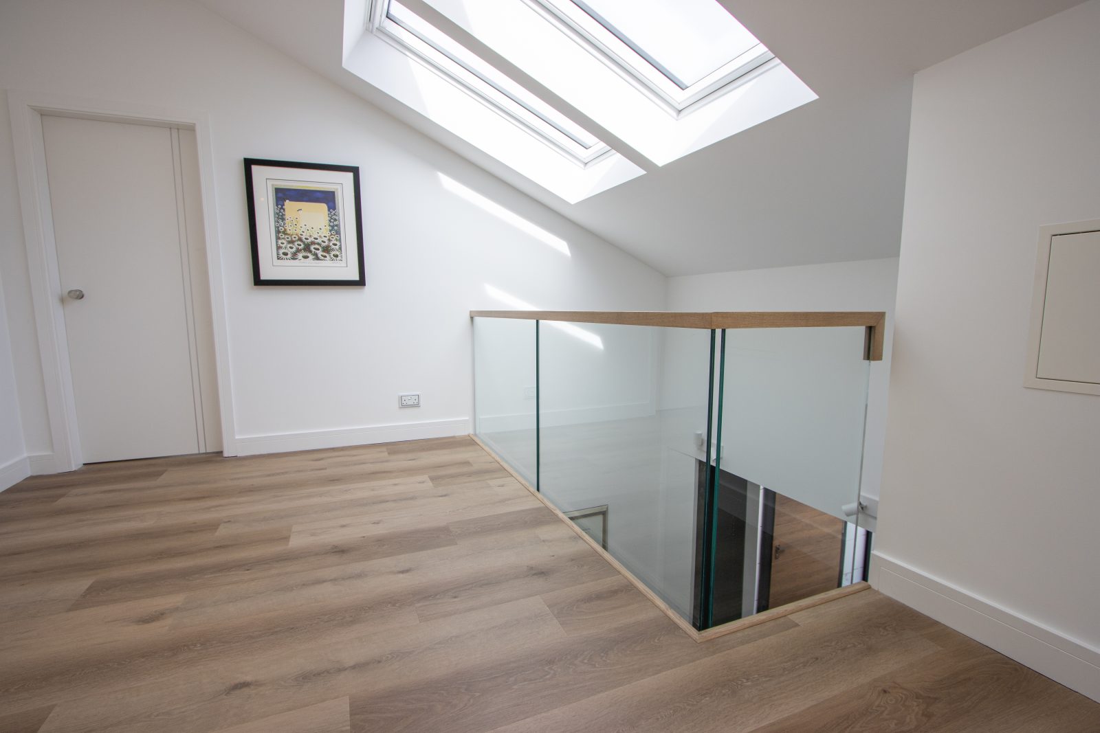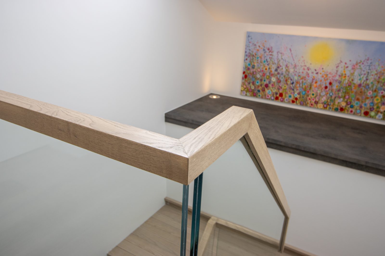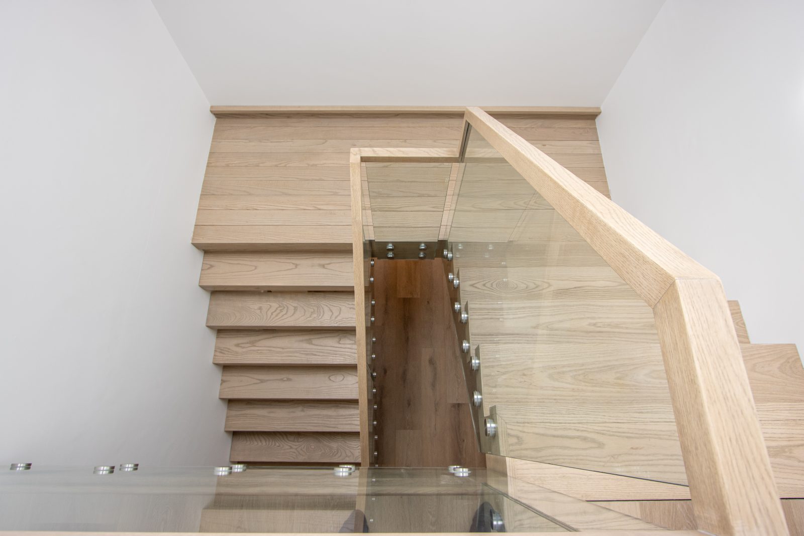 Constructed from solid American White Oak and French polished to match the flooring, the staircase delivers warmth and consistency throughout. The 17.5mm laminated glass provides strength while maintaining a light, open feel.